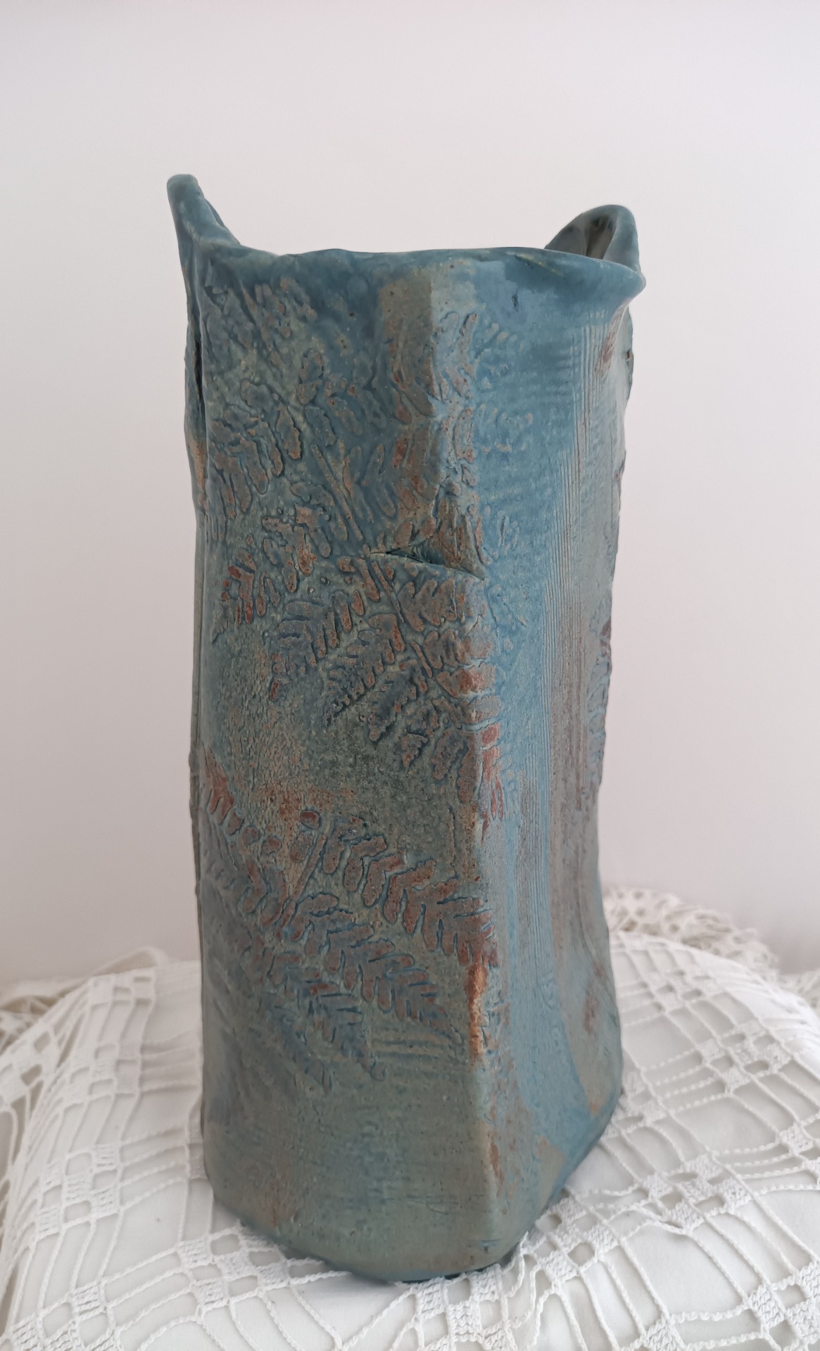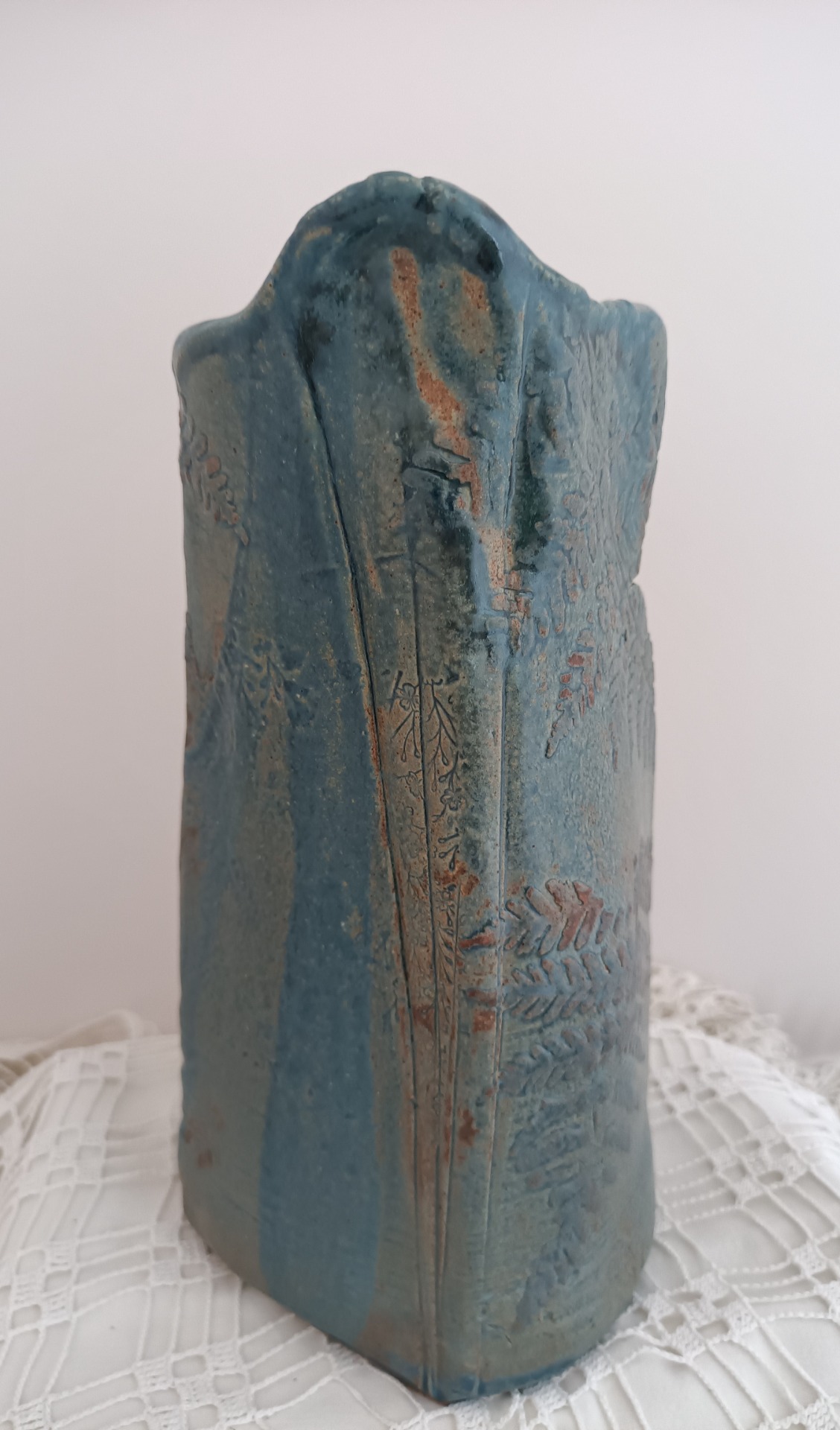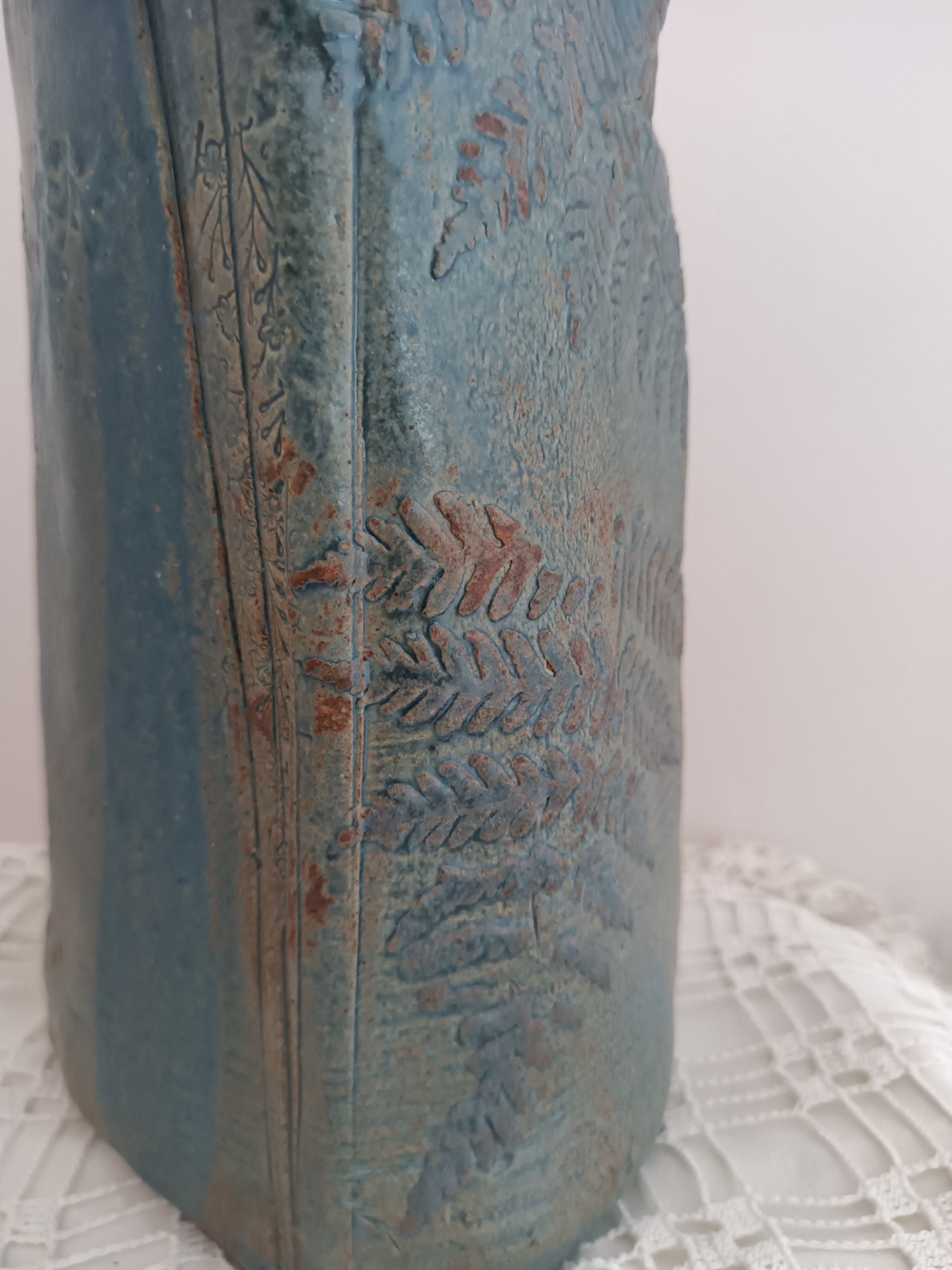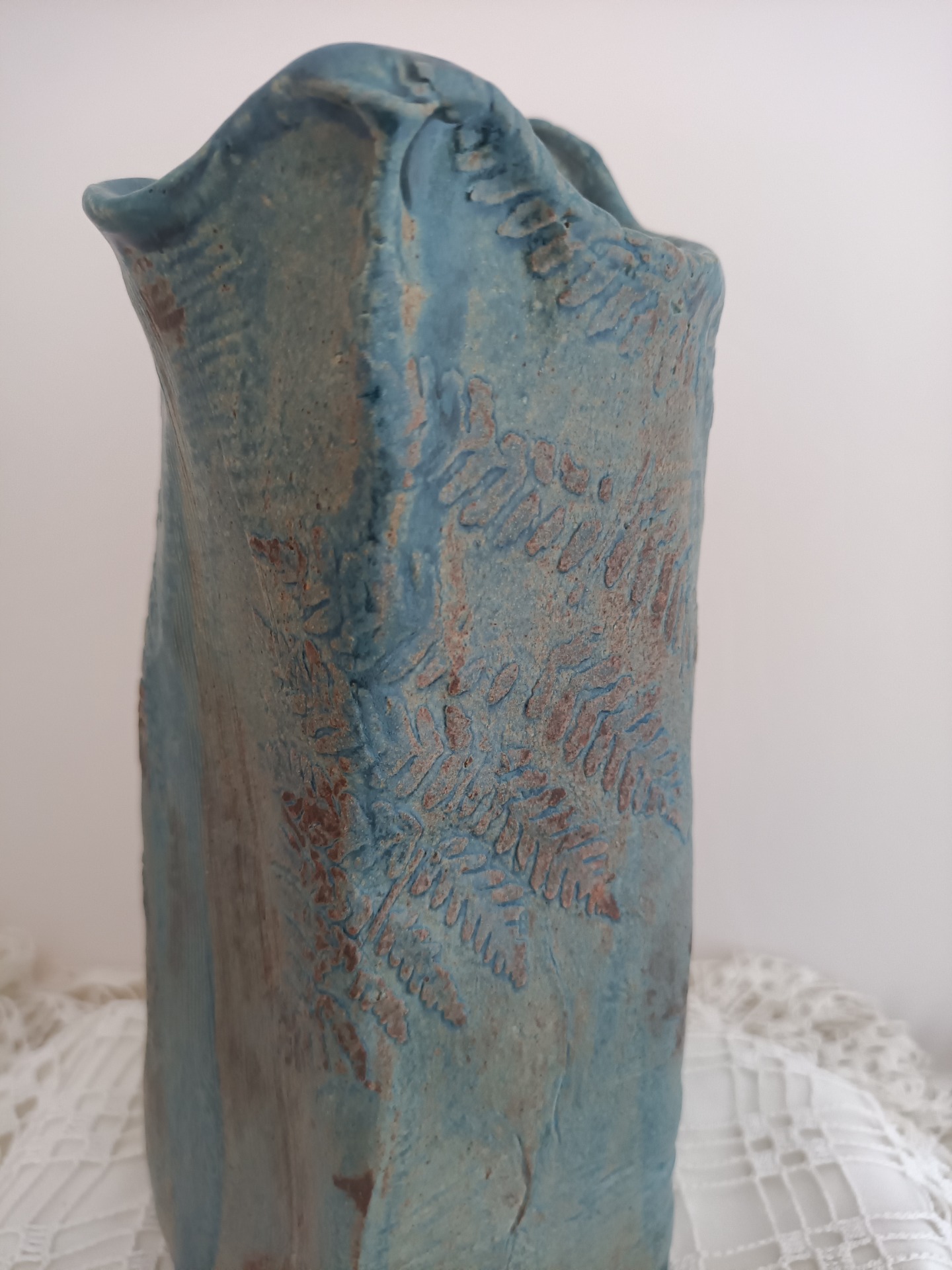 Originální váza - socha s dekorem kapradiny. Modelovaná váza s reliéfním povrchem, na kterém glazura vytváří různé modré, zelené a hnědé odstíny. Při pohledu z různých stran se proměňuje i její tvar. Svojí robustností zajistí stabilitu vašich květinových instalací.