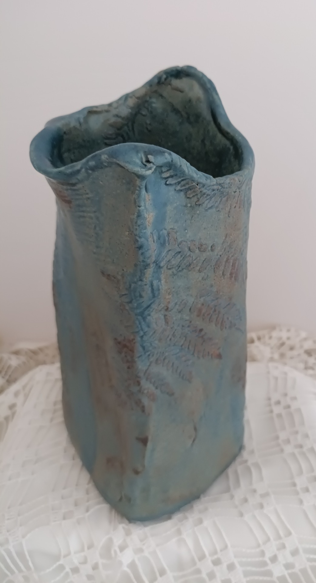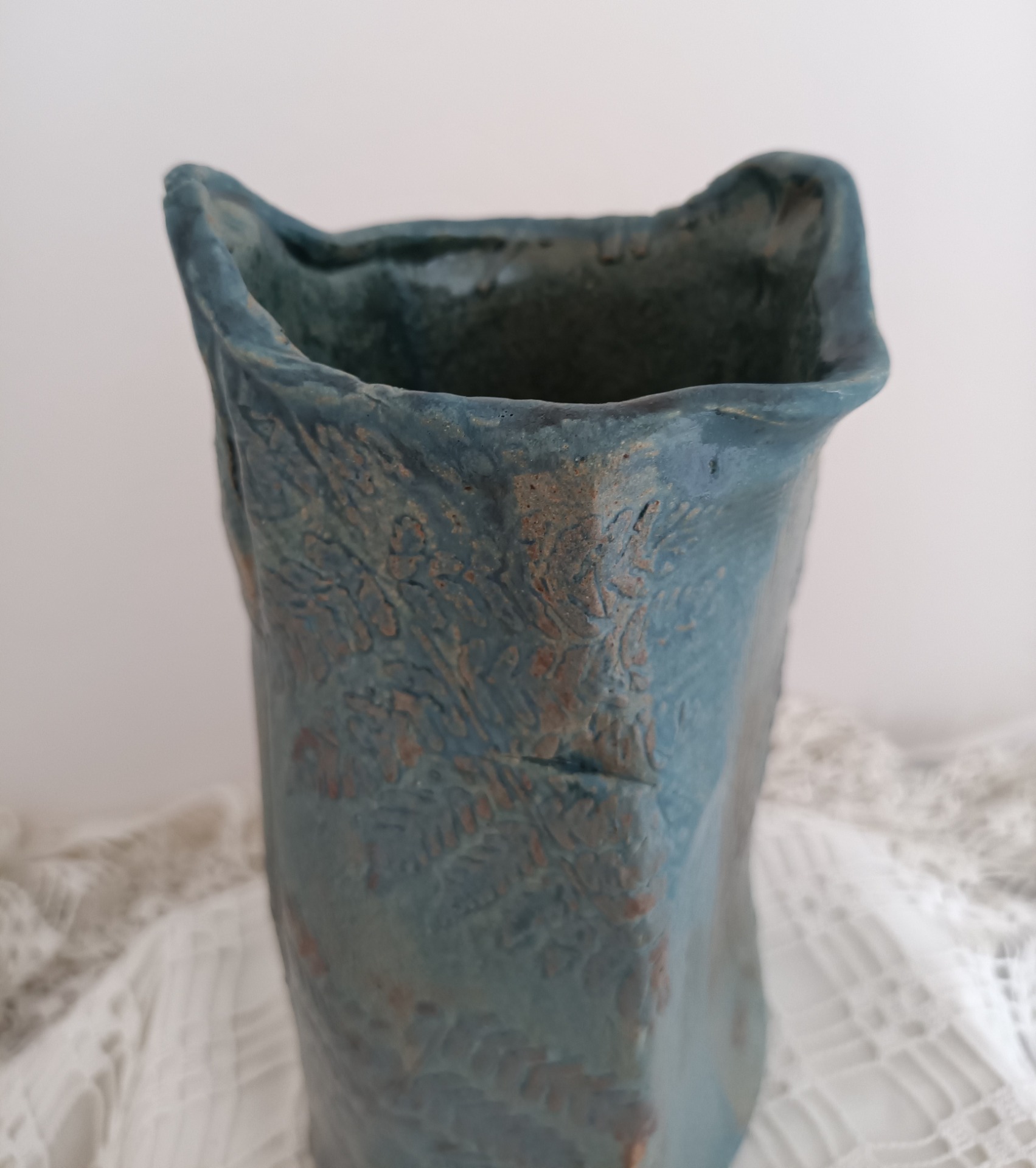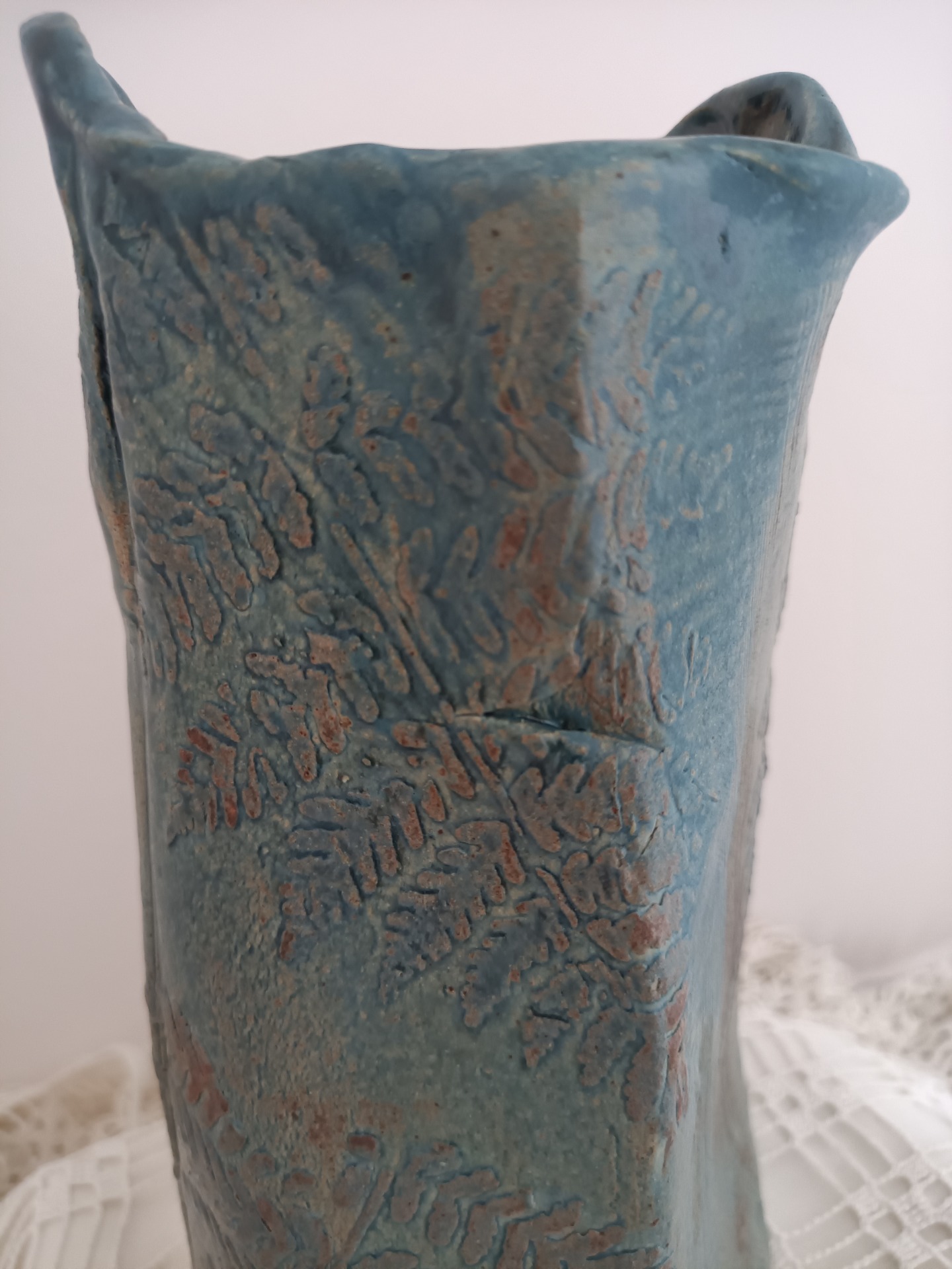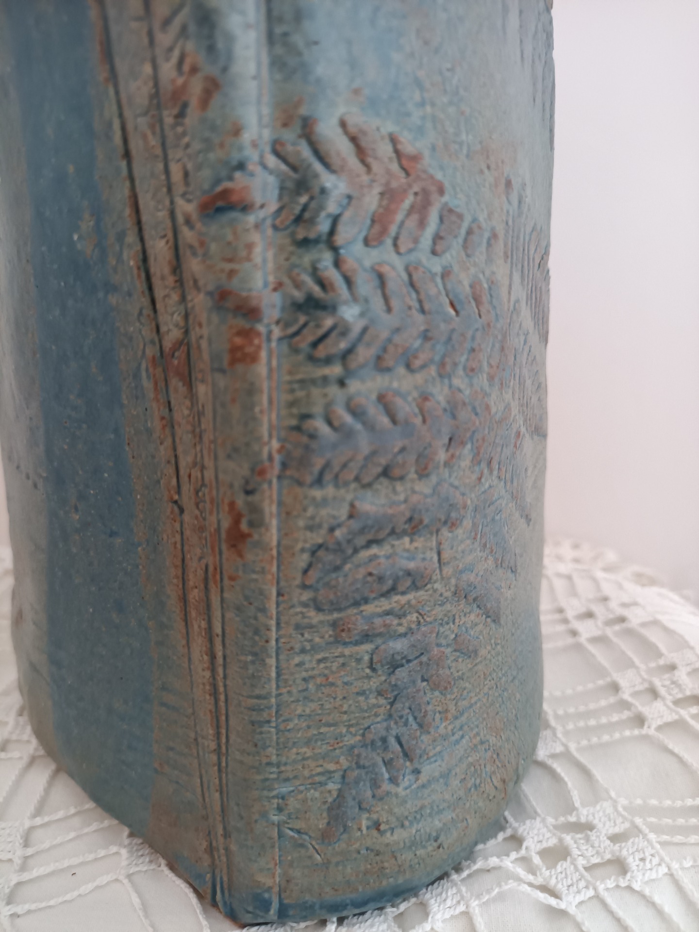 Originální váza - socha s dekorem kapradiny. Modelovaná váza s reliéfním povrchem, na kterém glazura vytváří různé modré, zelené a hnědé odstíny. Při pohledu z různých stran se proměňuje i její tvar. Svojí robustností zajistí stabilitu vašich květinových instalací.